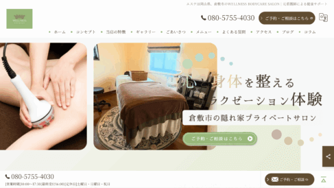 倉敷市におけるWELLNESS BODYCARE SALONは、心から安らげる癒しのひとときをお客様に提供する特別な存在として、理想の自分との出会いを実現するための第一歩をサポートしています。プライベートサロンならではの落ち着いた空間で、日常から離れた贅沢な時間をお過ごしいただきながら、外見と内面の両方からの美しさを引き出すケアを実践いたします。